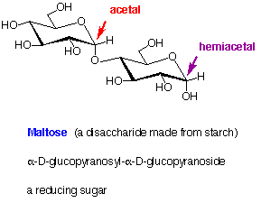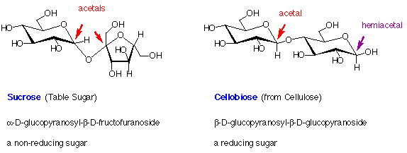 In the above structures, the anomeric carbons (acetal or hemiacetal) are indicated by coloured arrows. The full systematic names of the sugars are given below their common names.